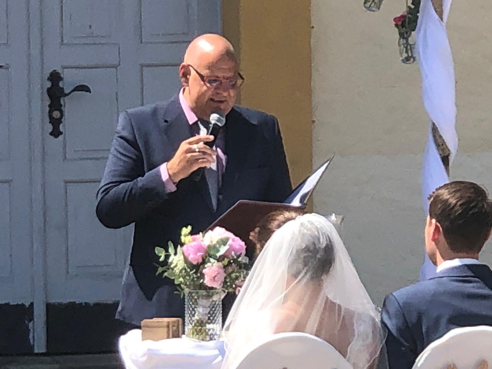 Ich war mit dem Auto gut durchgekommen – ich erlebte eine schöne Fahrt und hatte den Sonnenschein im Gepäck. Vor dem Schloss Niederweis war bereits alles aufgebaut. Die beiden Trauzeugen waren auch schon zur Stelle und rollten noch schnell die mitgebrachten deutschen Übersetzungen der Rede. 14:30 Uhr sollte die Trauung starten – aber die Gäste steckten mit dem Zubringerbus fest. Aber ich bin felexibel und so ging es eben ein paar Minuten später los. Bei Livemusik betrat die wunderschöne Braut die Szene. Deutsche und schwedische Gäste gleichermaßen waren begeistert. Was folgte war eine emotionale freie Trauung in Englisch auf Schloss Niederweis. Ich erzählte die Geschichte des Kennenlernens, des sich findens – natürlich durfte auch die Geschichte über den außergewöhnlichen und ziemlich coolen Heiratsantrag von Magnus nicht fehlen.